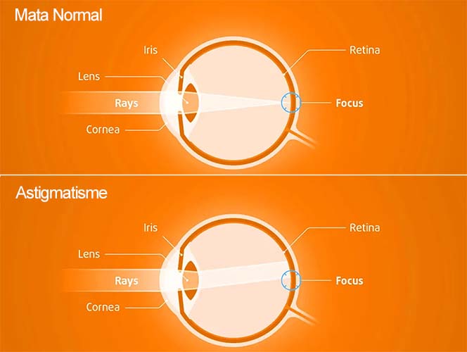 Pada mata normal, bias cahaya jatuh pada sebuah titik fokus tepat di retina. Sehingga penglihatan jelas dan tidak kabur, baik ketika melihat objek yang jauh maupun dekat. Pada mata silinder, bias cahaya jatuh pada titik fokus lebih dari satu. Objek–baik jauh maupun dekat- terlihat tidak fokus sehingga garis lurus pun tampak miring.