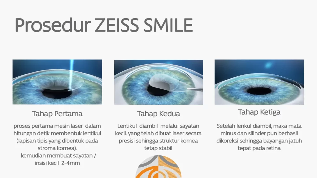 Teknologi koreksi penglihatan terbaru ZEISS SMILE. Metode paling mutakhir Laser Vision Correction (LVC) dengan laser untuk membuat sayatan mikro tanpa flap. Proses dengan kenyamanan lebih tinggi karena sayatan yang sangat kecil, mempercepat pemulihan, dan risiko mata kering.